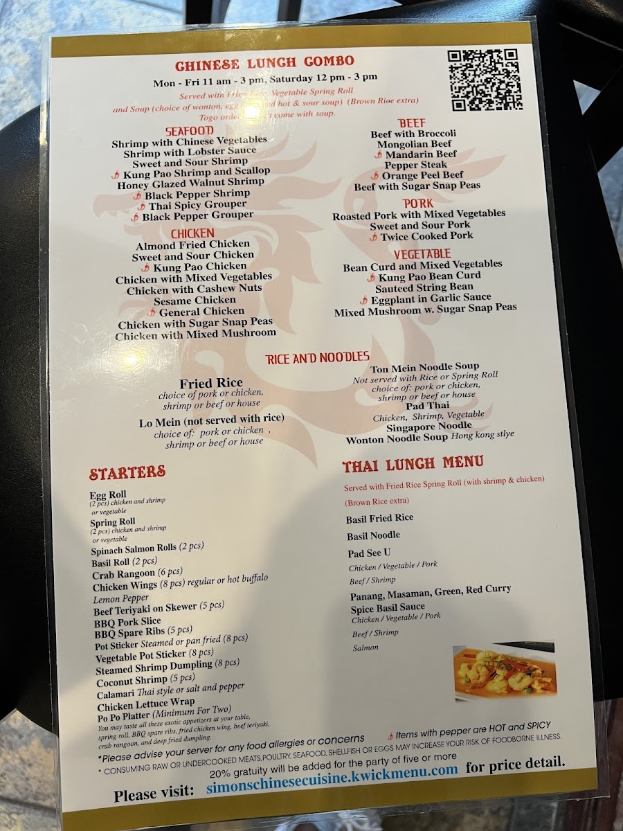 When you step into Simon's Chinese Cuisine, you’re in for a treat that goes beyond your typical takeout. The Simon's Chinese Cuisine Menu offers a delightful range of dishes that will transport your taste buds straight to China, with each meal carefully crafted to capture the true essence of traditional flavors. From the crispy, golden spring rolls to the rich, aromatic stir-fries, there’s something for every palate. If you're a fan of spice, the Szechuan-style dishes will certainly hit the spot, while the classic kung pao chicken offers a more familiar but equally delicious choice. Pair your meal with a refreshing cup of jasmine tea, and you’ve got the perfect combination for a satisfying dining experience. Whether you're here for a quick bite or a relaxed meal with friends and family, the menu promises to please with both variety and authenticity.
